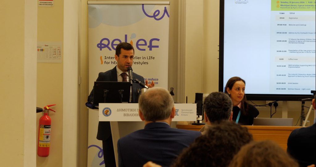 A national awareness event in Cyprus took place on Tuesday 13 January 2026 at the Municipal Library of the Cyprus University of Technology, co-hosted by CUT, CSI and the Cyprus National Addictions Authority (NAAC). The programme included welcome greetings from the three host organisations, an address by EU4Health Project Officer Julián Rueda (HaDEA), a keynote by NAAC Executive Director Dr. Konstantinos Stylianou on e‑tobacco use among children in Cyprus and internationally and the priorities of the national strategy, and a joint presentation of the RELIEF initiative by Paula Proestou (CSI) and Dr Angelos Kassianos (CUT). Sessions from Dr Cornel Radu-Loghin of the European Network for Smoking and Tobacco Prevention (ENSP) on WHO FCTC Article 14 implementation and from Prof. Inga Dóra Sigfúsdóttir of the Reykjavík University on the Icelandic Prevention Model showcased international best practices, followed by an extended Q&A and networking lunch that facilitated discussion among policymakers, practitioners, researchers and community stakeholders.