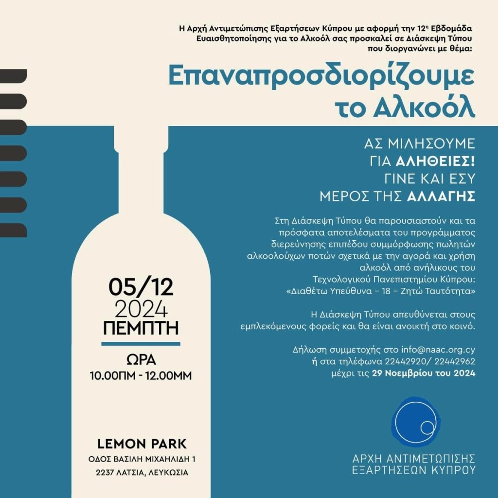 The Cyprus National Addiction Authority (NAAC) organized a press conference on the theme “Redefining Alcohol”, on 5 December 2024, as part of the 12th Alcohol Awareness Week (AWW).